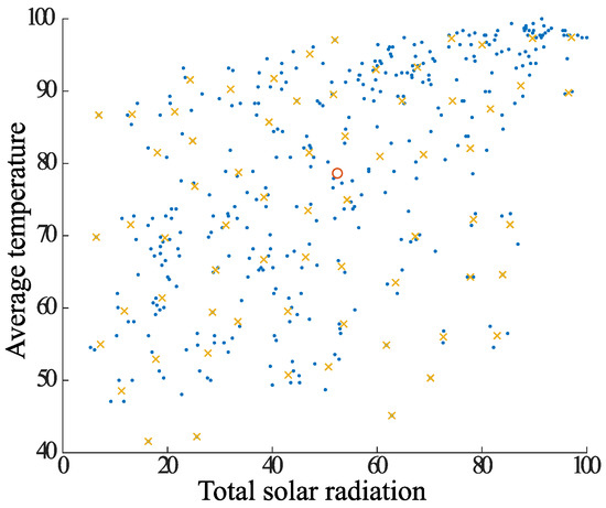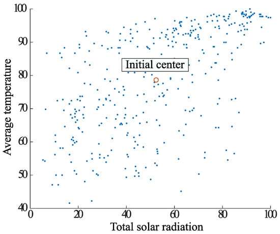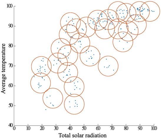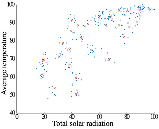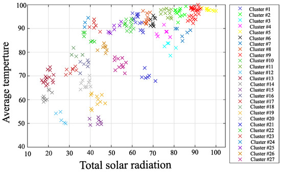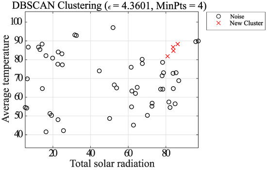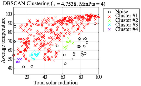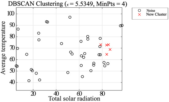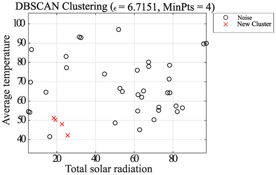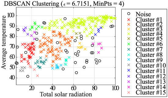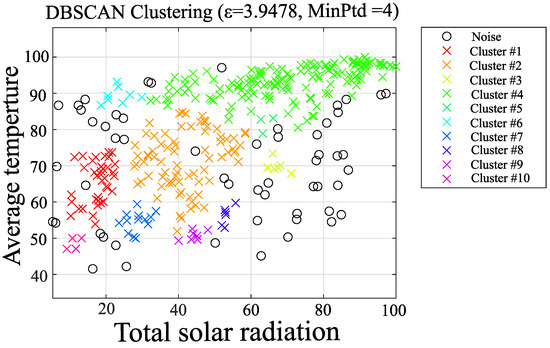 In Case 2, the DBSCAN approach is used to remove noisy elements in the dataset, followed by classification of the elements using the k-means method center-of-gravity update, and finally final clustering using the k-means method. The proposed clustering algorithm is shown below. It is also adapted to clustering using the data combinations shown in Table 1. Figure 13, Figure 14, Figure 15, Figure 16, Figure 17 and Figure 18, which shows Case 2, uses the same combination of average temperature and total solar radiation as Case 1.