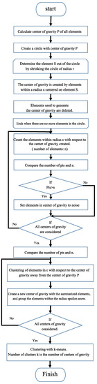 - For every center of gravity obtained, a judgment is made as to whether it has Pts elements within a radius , and all elements within the circle of the center of gravity that do not satisfy the condition are considered noise.