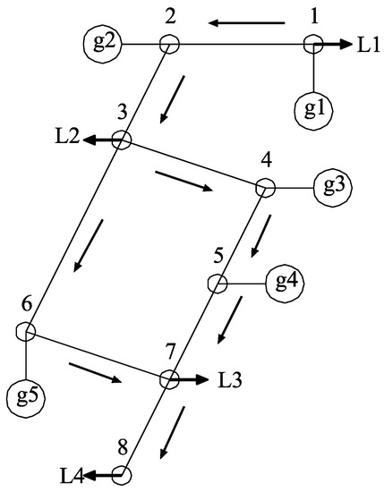 The small power system model with eight bus lines used in this study is shown in Figure 21. In Figure 21, - represent the load demand, and the respective percentages are 9%, 24%, 23%, and 43%. – indicate the locations of thermal power generators, and a total of 12 thermal power generators are assumed to be installed, with a total maximum output of . For load demand, we used data for fiscal year 2016 (April 2016–March 2017) published by Okinawa Electric Power Company, Inc. Photovoltaic systems were considered to be installed in the power system, and a total of 270 MW of photovoltaic systems were assumed to be installed on each load bus line at the same ratio as the load. The solar radiation was predicted by the neural network function of Matlab using data from 2015, and the prediction error from the same day was derived.