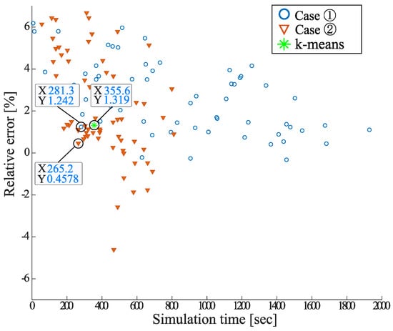 Figure 23 shows the results using case 1, case 2, and clustering by the k-means method. Figure 23 shows and compares the best points in terms of simulation time and cost error among the three cases. The results of the DBSCAN clustering in the elements of Table 1 are the combination of data 4 and data 6 (total solar radiation and average temperature), case 1 is the combination of data 2 and data 12 (total load demand and weekday, weekend and holidays), case 2 is the combination of data 6 and data 9 (average temperature and minimum load hours).