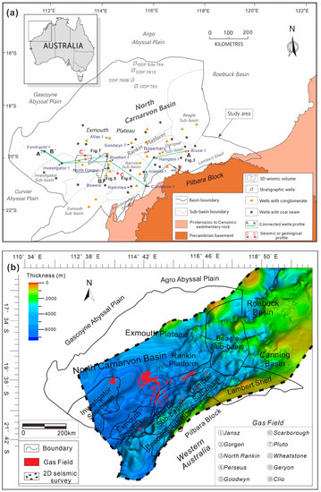The North Carnarvon Basin (NCB) is located at the southern part of the Northwest Shelf of Australia (Figure 1a); the basin is a giant oil and gas bearing basin formed by continuous rifting and subsidence from the Late Paleozoic to the Cenozoic [41,43]. Since the first oil field discovery in the NCB in 1954, more than fifty oil and gas fields have been put into hydrocarbon production, including the Jansz, Gorgon, North Rankin, Perseus, Goodwyn, Sarborough, Pluto, Wheatstone, Geryon, and Clio gas fields (Figure 1b). The land and sea regions of the basin cover approximately 115,000 km2 and 535,000 km2, respectively, and the maximum water depth is approximately 3500 m [8,47].
