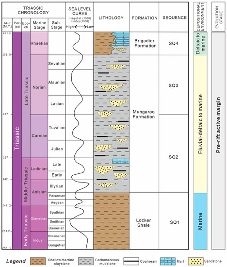 The study intervals are the Triassic Locker Shale (SQ1), the Mungaroo Formation (SQ2 and SQ3), and the Brigadier Formation (SQ4) (Figure 2). The Early Triassic Locker Shale was characterized by marine claystone and siltstone with shelfal limestone. The Middle–Late Triassic Mungaroo Formation was characterized by typical fluvial–deltaic to marine environments, and the large-scale coal-bearing shallow water delta covered much of the offshore NCB [47]. The palynologic associations published in previous studies [49,50] indicated typical fluvial–deltaic facies deposition. During the Latest Triassic to Early Jurassic, rapid subsidence caused the deposition of the transgressive Brigadier Formation, which was characterized by thin and interbedded claystone, marl, and sandstone. After the drowning of the Mungaroo delta, the depositional environment of the Brigadier Formation was deltaic to marine deposits.