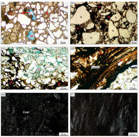 The thin sections of the Middle–Late Triassic Mungaroo Formation showed different petrographic features with characteristics of various mineral compositions and assemblages (Figure 3). The sandstone samples of the Mungaroo Formation were characterized as quartz sandstone and subarkose with poor and medium sorting and angular round quartz grains (Figure 3a,b). Some primary pores, secondary pores, siderite, organic matter filled, and quartz overgrowth were also identified in the thin section graphs. In addition, kaolinite cements, banded organic matter, rootlet debits (Figure 3c,d), and coal seams (Figure 3e,f) also developed within the delta plains of the Mungaroo delta system.