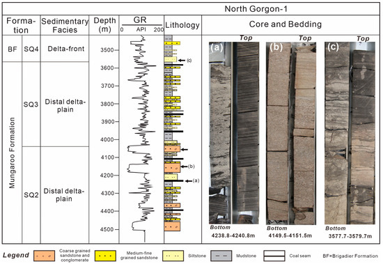 The gamma ray (GR) wireline log, lithologies and vertical evolution, delta–marine sedimentary facies, and the related cores and crossbedding sedimentary structures from North Gorgon-1. The depositional strata are related to the Mungaroo and Brigadier Formation (BF) from SQ2 to SQ4. The drilled cores’ photos indicate the depositional features of the (a) coal seam and carbonaceous mudstone, (b) coarse grained sandstone and conglomerate of the distributary channel sandstone, and (c) interbedding of the distributary channel sandstone and mudstone of the interdistributary channel bay.