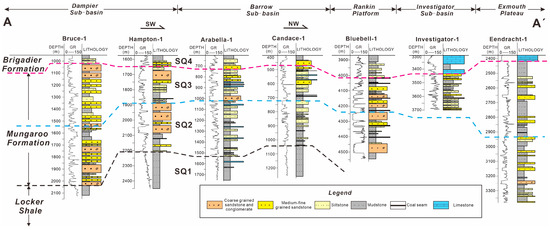 The cross-wells’ stratigraphic profile A–A′ of the Triassic Locker Shale (SQ1), Mungaroo Formation (SQ2 and SQ3), and Brigadier Formation (SQ4), showing the characteristics of the gamma ray (GR) wireline log, lithologies, lithological association, and vertical evolution from bottom to top. See Figure 1a for the location of the cross-wells profile A–A′.