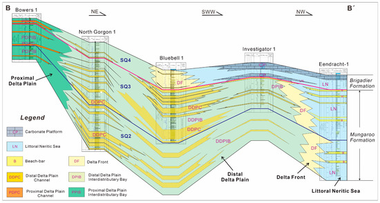 Cross-well profile B–B′ showing the sedimentary facies (proximal delta plain channel/interdistributary bay, distal delta plain channel/interdistributary bay, delta front, beach bar, carbonate platform, and littoral neritic sea) of the shallow-water delta system of the Middle–Late Triassic Mungaroo and Brigadier Formation (BF) from SQ2 to SQ4. The scale of the delta is gradually decreasing accompanied by vertical changes in the sedimentary facies and lithologic association. See Figure 1a for the location of the cross-wells profile B–B′.