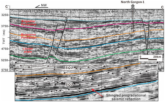 The thickness map of the Triassic strata in the North Carnarvon Basin (Figure 1b) shows that the topography of the study area had a relatively gentle slope with a gradient of approximately 1.2° to 2.3°. The cross-well seismic profile C–C′ (Figure 7) presented a typical low-angle shingled progradational seismic reflection configuration of the SQ2 and SQ3, while the underlying Locker Shale (SQ1) and overlying Brigadier Formation (SQ4) were characterized by a parallel or subparallel seismic configuration (Figure 7). Integrated with the drilled-well based sedimentary facies analysis (Figure 4, Figure 5 and Figure 6), the shingled progradational reflection in this research corresponded to the large-scale proximal and distal delta plain, with typical distributary channel gravel-rich or sand-rich deposits. In contrast, the parallel or subparallel seismic reflection could be linked to the interdistributary bays with mud-rich facies, carbonaceous mudstone, or coal seam deposits (Figure 7).