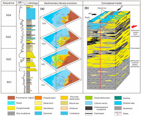 The lithology, GR wireline log feature, facies distribution and evolution, and the related three-dimensional conceptual model of the Triassic strata from the Locker Shale to the Brigadier Formation in the NCB. (a) The sedimentary facies maps of the SQ1 to SQ4 indicate the distribution pattern of the shallow water delta system. (b) The three-dimensional conceptual model of the the Locker Shale to the Brigadier Formation with typical lithologic distribution.