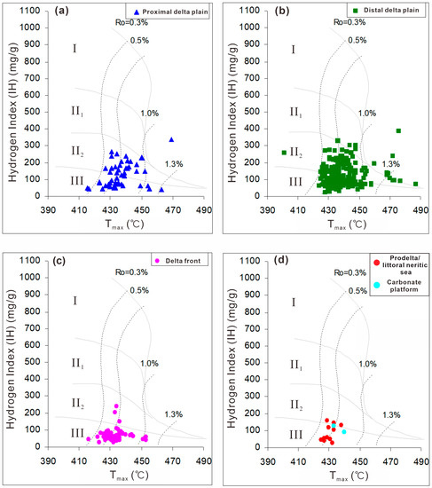 Organic matter types, maximum pyrolysis peak temperature (Tmax), and hydrogen index (IH) characteristics of the Mungaroo Formation source rocks in different sedimentary facies or subfacies, including the (a) proximal delta plain, (b) distal delta plain, (c) delta front and (d) prodelta, littoral neritic sea, and carbonate platform.