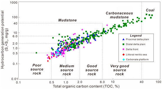 In addition, a series of geochemical analyses of mudstone, carbonaceous mudstone, and coal seam source rock samples (>200) from different sedimentary facies or subfacies of the shallow-water delta system were also carried out in this study. The test items of hydrocarbon source rock mainly included the total organic carbon (TOC), hydrocarbon generation potential (S1 + S2), hydrogen index (HI), maximum pyrolysis peak temperature (Tmax), and organic maceral compositions in various sedimentary facies. These geochemical elemental analyses were carried out at the State Key Laboratory of Biogeology and Environmental Geology, China University of Geosciences (Wuhan). Based on replicate analyses of the Chinese national standard GB/T 19145-2003 [51], the analytical precision of the TOC measurements was better than 0.5 wt%.