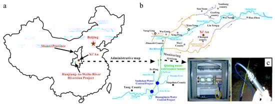 (a,b) Geographical location/layout map of the Hanjiang-to-Weihe River diversion project [], (c) Microseismic monitoring system of the Engineering Seismology Group.