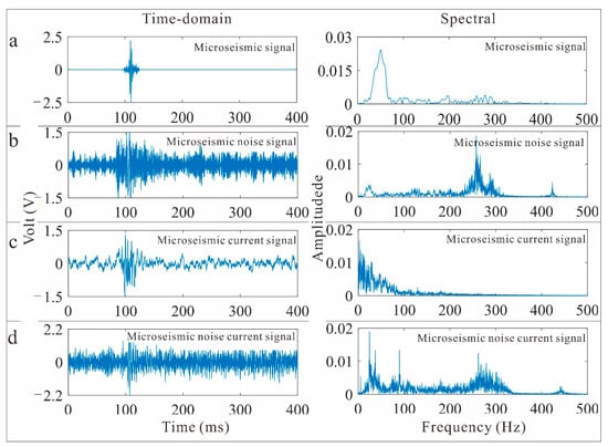 Waveforms of different signals: (a) microseismic signal, (b) microseismic noise signal, (c) microseismic current signal, (d) microseismic noise current signal.