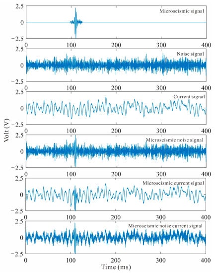Real monitored signals are irregular and nonstationary, and the signal waveforms are very complex and variable. Therefore, the pure microseismic signal and noise signal are superimposed to simulate a microseismic signal with noise. This approach can avoid the disadvantage of wavelet decomposition denoising with simulated signals, for which denoising can unrealistically effective. As shown in Figure 4, the microseismic noise signal, microseismic current signal and microseismic noise current signal were synthesized based on pure microseismic, noise and current signals. The microseismic signal information of associated with the synthesized signals underwent some changes. With the addition of noise, the local features were partially fused, the microseismic information was no longer obvious, and the SNR decreased. The synthesized signals encompass the features of all the noise signal samples in the monitored data. In most cases, the complex noise will change with time, and the corresponding frequency band will overlap with the frequency band of the microseismic signal; in some cases, the noise will completely hide the microseismic signal. In extreme cases, it is impossible for monitoring personnel to identify whether there is a real microseismic signal in a noisy signal; therefore, it is practical to reduce the noise in microseismic signals with low SNRs.