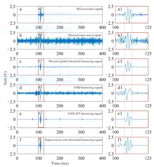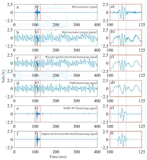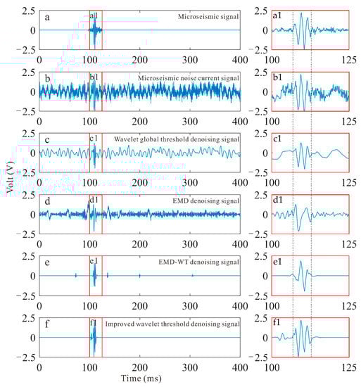 Comparison of the denoising results of t different methods for microseismic current synthesis signals: (a,a1) microseismic signal, (b,b1) microseismic current signal, (c,c1) Wavelet global threshold denoising signal, (d,d1) EMD denoising signal, (e,e1) EMD-WT denoising signal, (f,f1) improved wavelet threshold denoising signal.