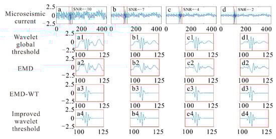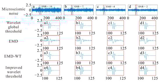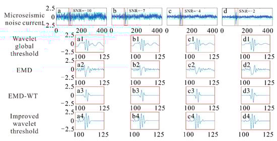 Comparison of the denoising of synthesized microseismic signals with noise, current and different SNRs: (a) microseismic noise current of SNR = −10, (b) microseismic noise current of SNR = −7, (c) microseismic noise current of SNR = −4, (d) microseismic noise current of SNR = −2, (a1,b1,c1,d1) Wavelet global threshold denoising signal, (a2,b2,c2,d2) EMD denoising signal, (a3,b3,c3,d3) EMD-WT denoising signal, (a4,b4,c4,d4) improved wavelet threshold denoising signal.