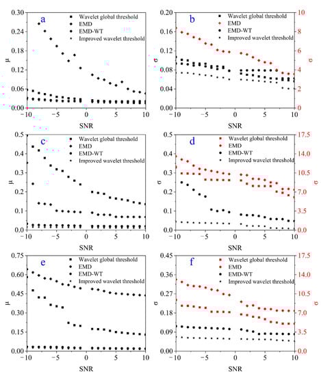 Based on the denoising of synthetic signals (with construction noise, current interference and mixed noise) with different SNRs, we observed that the signals denoised with the improved wavelet threshold method are the closest to the original signals. Furthermore, we plot the variations in μ and σ as the SNR decreases, as shown in Figure 11. As the SNR decreases, μ and σ for the improved wavelet threshold, EMD-WT, EMD and wavelet global threshold denoising methods increase. Surprisingly, the improved wavelet threshold yields the smallest μ and σ, and their changes are smoother. In contrast, for the wavelet global threshold and EMD methods, μ and σ are much larger than those for the improved wavelet threshold method, and the rate of change is larger when denoising different synthetic signals. Although the μ value for of EMD-WT is relatively small, the attenuation of σ is significant with decreasing SNR. It is confirmed that the improved wavelet threshold method provides sufficient denoising ability to adapt to signals with different SNRs.
