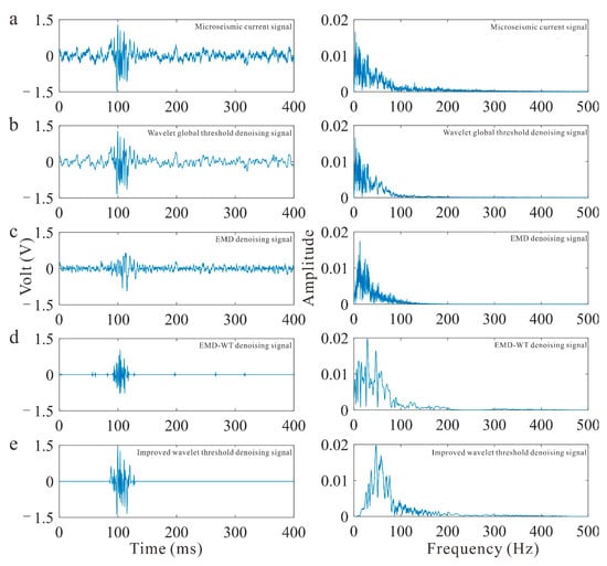 Comparison of denoising effects for an actual microseismic signal with noise and current: (a) microseismic noise current signal, (b) Wavelet global threshold denoising signal, (c) EMD denoising signal, (d) EMD-WT denoising signal, (e) improved wavelet threshold denoising signal.