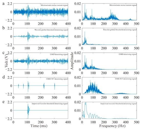 The denoising of the synthesized microseismic signals with current information was explored (Figure 6), and the wavelet global threshold and EMD denoising methods do not effectively reduce the noise in these signals. Even the microseismic waveform is removed, resulting in only current interference noise after denoising. The EMD-WT denoising method can effectively reduce noise, but some microseismic information is not retained after denoising, and there is a distortion problem. However, the improved wavelet threshold denoising method can effectively remove the current information, retain a denoised microseismic signal that is similar to the pure microseismic signal, and highly denoise the low-voltage signal.