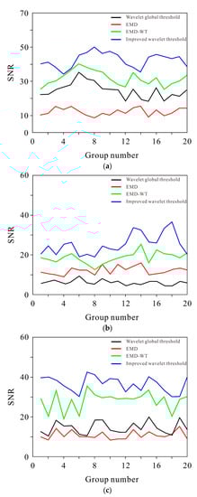 For microseismic signals with noise, current and different SNRs (Figure 10), as the SNR increases, the denoising ability of the wavelet global threshold increases; that is, a synthetic signal with a low SNR cannot be effectively denoised, and the microseismic information changes after denoising. EMD displays no denoising ability. The EMD-WT results are similar to those in Figure 8 and Figure 9 and show the phenomenon of transition denoising; additionally, the original signal cannot be completely preserved. The improved wavelet threshold method displays the strongest denoising ability and the best denoising effect; it not only filters out and removes the mixed noise but also retains as much useful microseismic information as possible.
