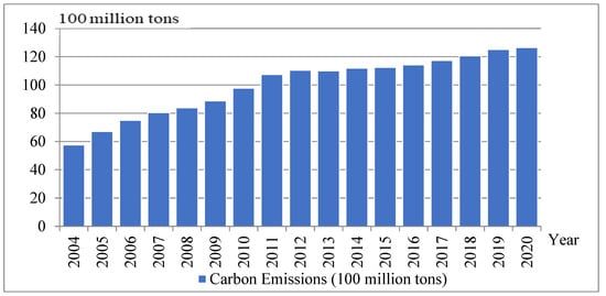 According to the calculation method of carbon emissions, carbon emissions in China from 2004 to 2020 are calculated based on the data on energy consumption, and the calculation results are shown in Figure 1.