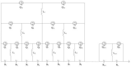 The cascade Buck-Boost balance topology adopts the hierarchical structure of the series battery pack. The adjacent single cells form a set of topologies, and the adjacent two groups form a new set of structures. As shown in Figure 1, B1 and B2, and B3 and B4, form a set of balanced structures, respectively, and B1 + B2 and B3 + B4 form a set of balanced structures, and so on.