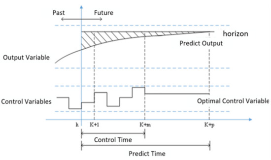 The basic idea of model predictive control is to solve a finite time-domain open-loop optimization problem to obtain a control sequence based on the system state obtained from measurements at the current moment; however, only the first element of the control sequence is applied to the system, as shown in Figure 2 [18]. At the next moment, the process is repeated based on the new measured state. The online repetition of solving the open-loop optimization problem while predicting the time domain rolls forward to infinity. Closed-loop control is obtained by solving the relatively easy open-loop optimization problem. The process mainly consists of a prediction model, rolling optimization, and feedback correction.