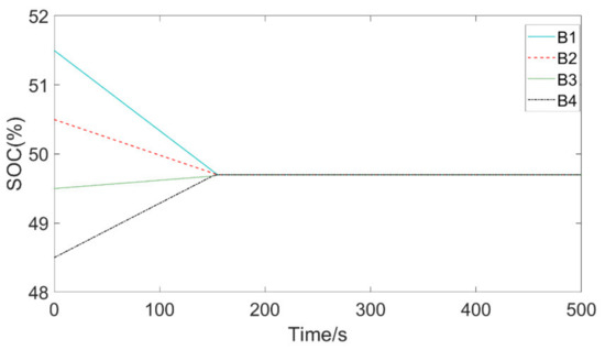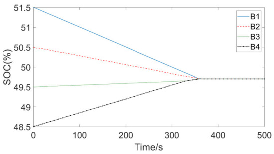 The static balancing of four series batteries, ignoring the battery self-discharge effect with a short time, and online access to the SOC value, are the balanced quantitative indicators of the balance control strategy and the input variables of the balance system. The initial values of SOC of every single cell were set to 51.5%, 50.5%, 49.5%, and 48.5% under the condition of battery resting, and other related parameters were as shown in Table 2.