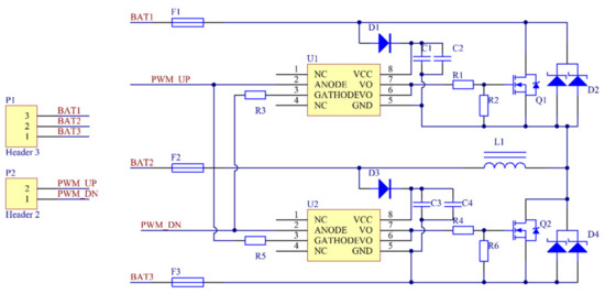 Combined with the simulation circuit, the schematic diagram of the balance circuit is designed. As shown in Figure 6, the MOS tube with small conduction impedance and a large working voltage and current—IRF3205—is selected. According to the conduction voltage drop and the maximum freewheeling requirements, we selected a 16 CTQ100 diode. Through the TLP250 optocoupler isolation of the power circuit and control circuit, we effectively avoid interference from the power circuit to the control loop; the selected magnetic ring inductor has an operating current up to 2 A, which can efficiently store energy to achieve energy transfer. The model predictive control was transplanted to STM32 to complete the equilibrium experiment.