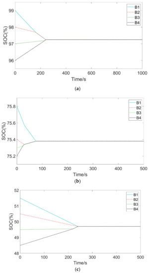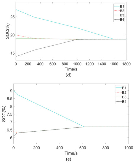 Figure 7a–e said the battery under the MPC from different SOC to balanced and consistent. In order to further describe the equilibrium process in the experiment, the SOC range before the balance was set as SOCmax-SOCmin and the average SOC of the series battery pack was . The balance results under different states are shown in Table 3.