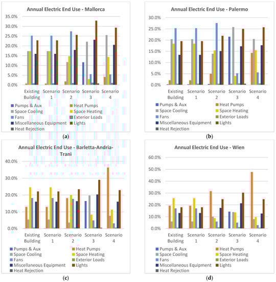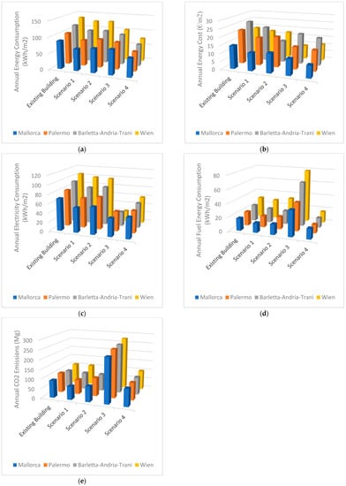 Concerning annual fuel energy consumption, Scenario 4 produced the most significant decrease in Palermo, Barletta-Andria-Trani, and Wien (40.05%, 41.10%, and 45.09%, respectively), while Scenario 1 achieved the most considerable reduction in Mallorca (23.05%). Scenario 3 increased yearly fuel energy usage in all scenarios due to the use of gas boilers to satisfy heating requirements.