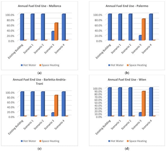 Figure 9 presents the percentage of fuel consumed for hot water and space heating. Regarding these charts, in the current state of the building and Scenarios 1, 2, and 4, 100% is consumed for domestic hot water production, as for the cover of cooling and heating loads, electricity is used. In Scenario 3, the percentages of fuel used for space heating and hot water production vary depending on the city. More specifically, in Mallorca, 66% of the fuel energy used is for room heating, and the remaining 34% goes toward producing hot water. In Palermo, 81.5% of the fuel is used for space heating, while 18.5% is used to provide hot water. In Barletta-Andria-Trani, 14.1% of the fuel is utilized for hot water production, and 85.9% is consumed for space heating. Finally, in Wien, 12.5% is consumed for the production of hot water and 87.5% for space heating. The difference in the percentages is due to the fact that every city studied has different heating needs to cover, with Wien and Barletta-Andria-Trani having the most significant heating needs. In contrast, Mallorca and Palermo have more minor heating needs.