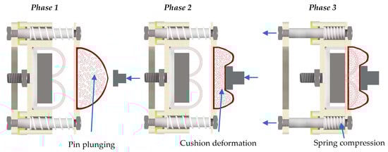 The principle of operation of the proposed solution is illustrated in Figure 3. The change of the cushion stiffness (by means of the change of MRF fluid viscosity) is based on the use of magnetic field attraction and the spring reaction forces. Three phases of movement are specified (Figure 3). In Phase 1, the gripper jaws are directed at the object to be gripped. Closing the jaws reduces the distance between the pad and the edges of the object. The springs remain fixed, and the cushion is undeformed. Phase 2 involves plunging the pin and deformation of the cushion. The depth of the plunge is determined by the force of the clamping jaws. Further plunging causes an increase in force, which the springs take over in Phase 3, reducing the distance from the magnetic field exciter. Phase 3 ends with the closing of the air gap between the bottom of the cushion and the face of the permanent magnet. The main advantages of this solution are simplicity of operation, low energy cost, lack of coil, stability of operating temperature conditions, and in particular, lack of an additional control system for the magnetic field excitation. At the same time, the main objective of the application of stiffening the cushion structure after grasping the object is preserved. The release of the grip is conducted in reverse order from Phase 3 to Phase 1.