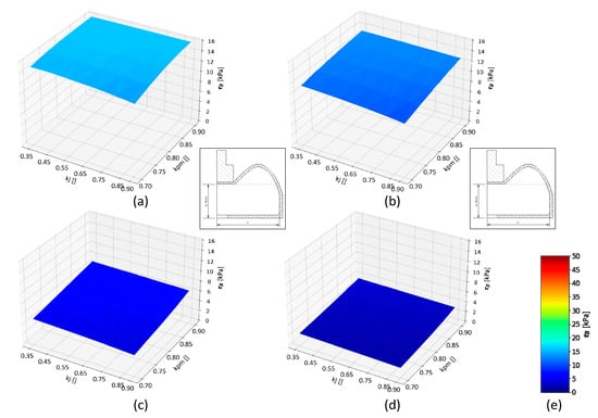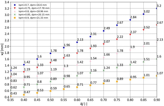 Due to the variability of dpm as a result of kpm, each time, the kj factor introduces an individual wj value within the configuration. The analyzed values of the kj factor according to Figure 6 are between 0.35 and 0.90 (0.05 step). The dpm and wj dimensions for each kj/kpm configuration are shown in Figure 6.
