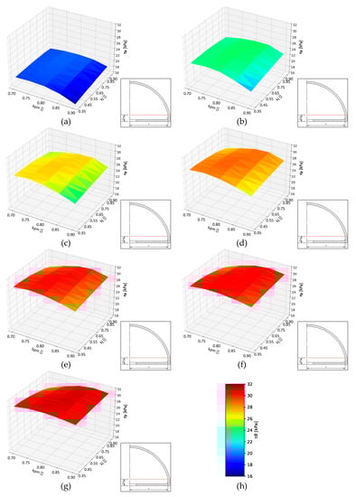 Average τB shear stress distributions for Instance 1 with z = 1 and gm equal to: (a) 2 mm; (b) 3 mm; (c) 4 mm; (d) 5 mm; (e) 6 mm; (f) 7 mm; (g) 8 mm; (h) color scale indicating shear stress value.