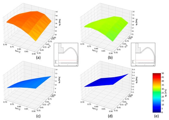 Shear stress distribution in the cushion cross section at gm = 6 mm for configurations: (a) kpm = 0.7 and kj = 0.35; (b) kpm = 0.8 and kj = 0.7; (c) kpm = 0.85 and kj = 0.65; (d) kpm = 0.9 and kj = 0.35; (e) color scale indicating shear stress value.