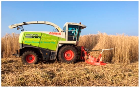 The most common system for the single-passage harvesting of giant reed consists of a self-propelled forage harvester (SPFH), a machine commonly applied in silage maize harvesting. In this system, biomass is flanked by a tractor–trailer unit receiving the chopped material, which is then shipped to a collection point [36].