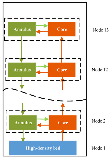 21] since it was first carried out. In the radial direction of the CFB boiler, the furnace is divided into two zones: the core area and the annular area. The core area is located in the center of the furnace, where the solid particles move upward and move fast. Near the furnace wall, solid particles move downward, and solid particles gather near the wall to form a annular area with a high density. The “core-annulus” model can not only reflect the non-uniformity of gas–solid two-phase distribution in the axial direction but also reflect its change in the radial direction, so it has attracted a great deal of attention since it was first reported. The “core-annulus” model in the CFB boiler is shown in
