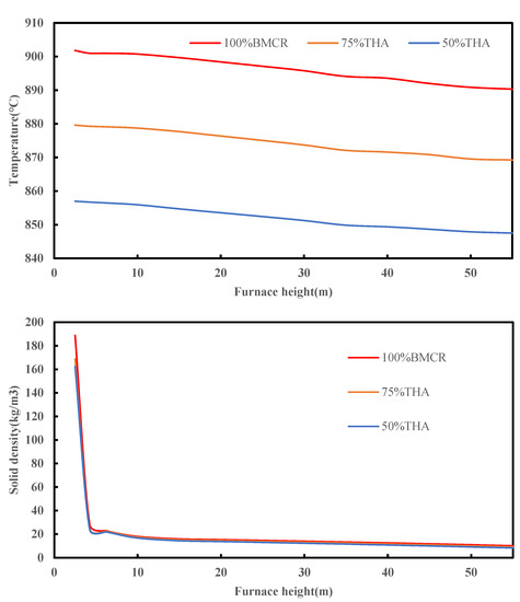 Figure 3 shows the temperature and solid particle concentration distribution in the furnace under different working conditions. It can be seen that the temperature in the furnace decreases gradually with the increase of furnace height. Compared with the pulverized coal-fired boiler, the temperature distribution along the furnace is more uniform due to the circulation of solid particles in furnace. The particle concentration decreases with the increase of furnace height, and the bed density at the bottom is significantly higher than that in the upper dilute-phase zone. The density distribution of solids in furnace is similar to Qiu’s work [