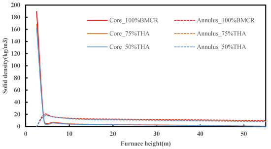 Figure 4 shows the solid density distribution of the core and annulus area in the furnace at different conditions. In the “core-annulus” simulation model, the first core node represents the high-density bed area, so the density of the first core node is much higher than other nodes. In the dilute-phase area, solids gather near the water wall, which causes a higher solid density in the annulus than in the core area.