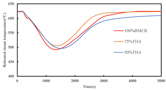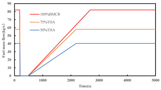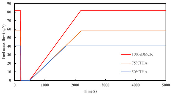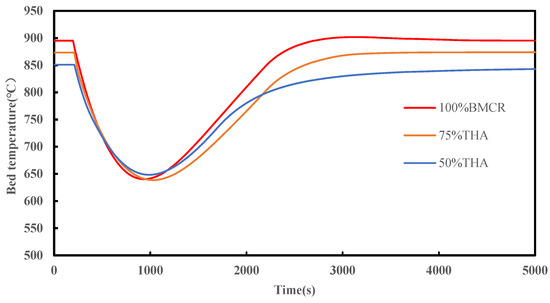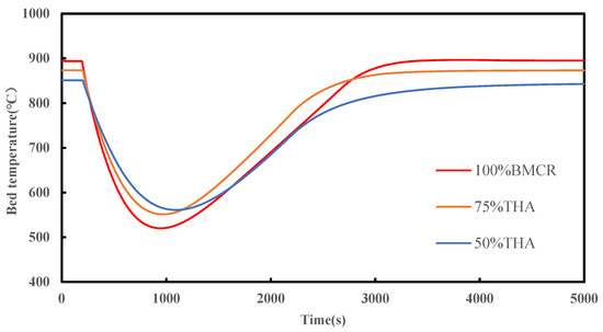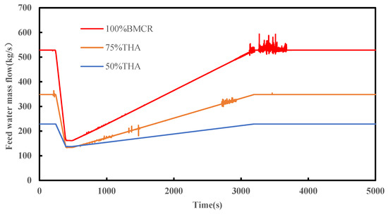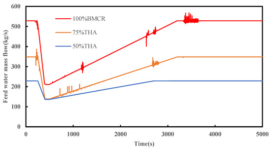 Figure 16 show the response of fuel mass flow rate and feed water mass flow rate during the BT processes. It can be seen that compared with the boiler MFT, the temperature of the furnace is higher than that of MFT since the primary air fan, secondary air fan, and induced draft air fan are shut down during BT, and the flue gas cannot take away the heat from the furnace. Five minutes after BT is triggered, the boiler starts the hot start-up process. About 60 min after BT is at 100% BMCR, the temperature of the main steam and reheated steam recover to the rated value. The temperature of the main steam and reheated steam reach the rated value after about 55 min under 75% THA condition. About 8 min after the boiler triggers BT under 50% THA condition, the moisture separator gradually switches from dry state to wet state, and the liquid level of water storage tank is controlled at 6.5 m. After that, the boiler BT is reset, and the coal mass flow, air mass flow, and feed water mass flow gradually increase. After about 25 min, the moisture separator gradually switches from wet state to dry state, and the main steam temperature, heated steam temperature, and bed temperature also increase gradually. After 40 min, the performance of the boiler gradually recovers to 50% THA.
