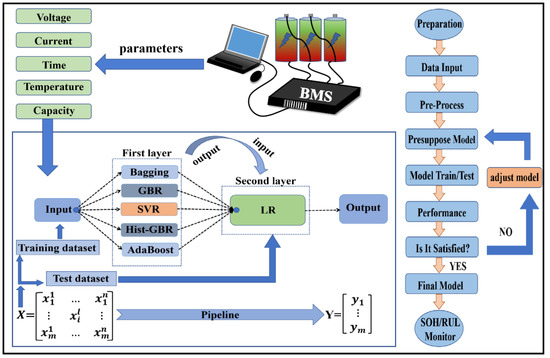 To improve the data-driven method for the evaluation of the battery states, this work proposed the SR model with a two-layer prognostic framework to predict the SOH and RUL. The SR model consists of six individual estimators, of which bagging, GBR, SVR, Hist-GBR, and AdaBoost were merged in the first layer and LR was used in the second layer. With the integration of the advantages of the different regressors, the SR model guarantees the high performance of the SOH and RUL estimation without too many parameter adjustments.