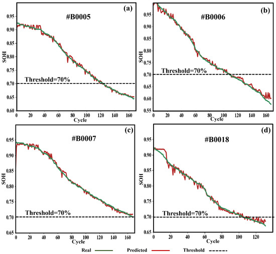 The real and estimated SOH of batteries #5 (a), #6 (b), #7 (c), and #18 (d), discharged at 2A and 24 °C, respectively.