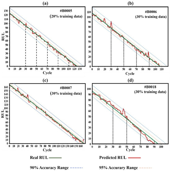 The SR model of the predicted and real RUL of batteries #5 (a), #6 (b), #7 (c), and #18 (d), discharged at 2A and 24 °C, respectively.
