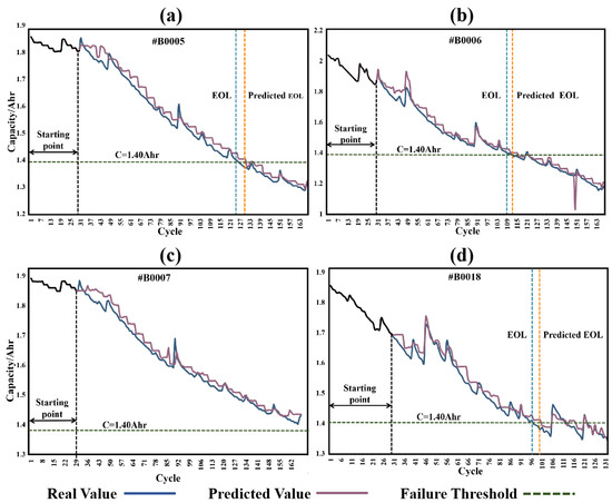 The DSR model’s predicted results and real decay trajectories with the increase in cycles for batteries #5 (a), #6 (b), #7 (c), and #18 (d), discharged at 2A and 24 °C, respectively.
