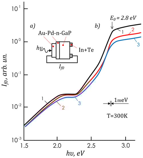 Researchers have been concentrating for a long time on the study of Schottky barriers (SBs) based on GaP. They are interesting as structures for developing different radiation-resistant photovoltaic and electronic instruments for high-frequency power electronics, ultraviolet (UV) photoelectronics, and solar energy [1,2,3,4,5,6,7,8]. The m-s-structures with SBs based on gallium phosphide are promising in the development of UV short-wave radiation photodetectors. Such devices are easy and inexpensive to produce and robust in operation, as the industry has mastered GaP as a wide-band-gap (high-energy-gap) semiconductor. The devices’ high PS in the UV region is provided by the high threshold energy (Eo = 2.8 eV, 300 K) of direct GaP optical transitions. The PS of an m-GaP structure with a Schottky barrier in the UV region (hν = 3.1 ÷ 6.0 eV) was studied more thoroughly than the PS in the visible light region (hν = 1.5 ÷ 3.1 eV). The study of the m-GaP structure visible light region provides important information on Schottky barriers and the fundamental parameters of GaP band structures.