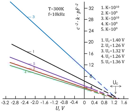 The capacitance-voltage characteristics of the Au-Pd-n-GaP structures were measured. For all the studied structures, the differential barrier capacitance dependence on the voltage at the potential barrier in the coordinates 1/C2 = f (U) at U = −3.0 ÷ 0.4 V obeyed a linear law (Figure 3, Figure 4 and Figure 5), which was in agreement with Schottky theory and allowed the direct determination of the qφBo from the expression qφBo = qUD − μ = qUC + kT − μ, where U is the diffusion potential, UC is the capacitive cutoff voltage, and μ is the level energy counted from the conduction band Fermi in the GaP bulk [29,30,31,32,33,34].