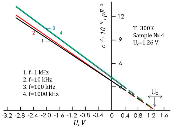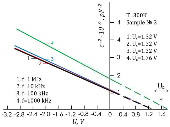At the temperature T = 300 K, we obtained the cutoff voltage from the intersection of the experimental dependences C = f(U) with an abscissa axis for different structures of U0C = UC 1.26–1.40 V (Figure 3). For the optimal Pd intermediate layer thickness d 20–35 Å, the qφBo values found by the two methods (If0~hν, C−2-U) turned out to be practically equal (see Table 1). In Figure 4, almost ideal diodes (sample No. 4) at different frequencies (f = 1÷ 1000 kHz) show the observed dependence of C−2 on U. It was found that in an ideal diode in the C−2-U characteristic, the value of UC remains constant. This means that in an almost ideal diode in a space charge layer, the internal electric field (samples No. 2, No. 4, and No. 5) does not change with frequency and the qφBo value remains unchanged. Figure 5 shows the dependence in C−2 coordinates on U for non-ideal diodes (No. 3, d 45 Å; β = 1.39) at different frequencies. It was found that in non-ideal diodes of the Pd intermediate layer with d > 35 Å the value of UC does not retain a constant, changing with the frequency (see Figure 5).