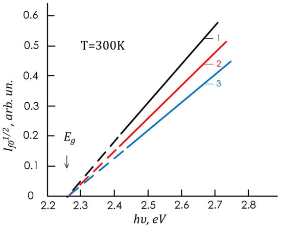 In the visible-light region, the photocurrent in the hν = 2.3–2.65 eV interval was due to electron transitions from the valence band to the X valley of the conduction band, while the photocurrent in the hν > 2.65 eV interval was due to electron transitions from the valence band to the “G” valley of the conduction band (E0 = 2.8 eV) and was located in the violet and ultraviolet regions (Figure 6, Figure 7 and Figure 8).
