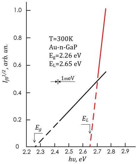 When analyzing the experimental dependence of If0 on hν (Figure 1, b) using the Spitzer and Mead method [11]: If0~(hν-Eg)2, where hν < Eo, EG was determined; for GaP, it was 2.26 eV at 300 K (Figure 6). To determine the threshold energy of direct optical transitions for GaP, a modernized photoelectric method was used [36]. By comparing the absorption spectrum of GaP [38,39,40] with the photocurrent spectra of Au-Pd-n-GaP structures in the ultraviolet regions, it was established (Figure 1, b and Figures 9 and 10) that the photocurrent If0 in m-s structures at hν < E0 usually increases exponentially with hν, and at hν > E0 it increases first linearly and then sublinearly. The linear section begins at hν = E0, which allows one to determine E0 directly from the photocurrent spectrum If0 of the m-s structure when the m-s junction is irradiated through the Au nanolayer, both under natural (Figure 1, b) and polarized (Figure 10) radiation. The Eo for GaP was determined by this method; it was 2.80 eV at 300 K.
