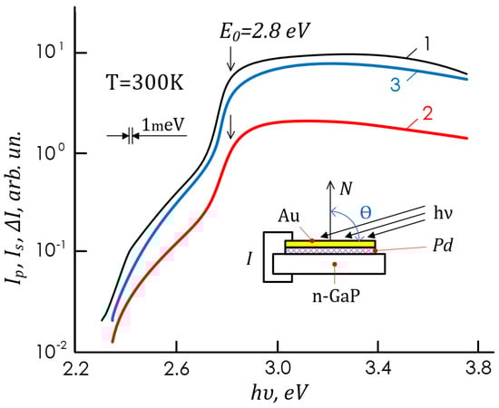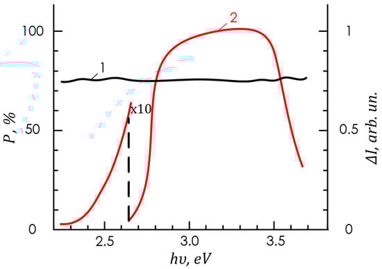 Figure 10 shows the induced PPL spectral dependence in typical SB structures at angles of incidence ⊖ = 80°. The features of the studied structures connected with the long-wave photocurrent edge of and . According to the dependences of the polarization photocurrent IP on hν and IS on hν, the Eg and E0 for GaP were determined using the well-known method [35,36,37,38,39]. The maximum value of the polarization difference of photocurrents ΔI (Figure 9, curve 3) in the obtained Au-GaP structures was achieved at angles of ⊖ = 70°. At ⊖ = 0°, following the selection rules for interband optical transitions in GaP [39], the polarization difference of photocurrents ΔI, and the PPL coefficient P = [ΔI/(IP + IS)], 100% of the studied structures turned out to be equal to zero, i.e., there was no PS to polarization. With an increase in ⊖, the PPL coefficient increased according to the law P~⊖2, in accordance with [26,35]. The maximum value P = 74% was reached at ⊖ = 80° and, according to [26], corresponded to the refractive index n = 3.2 characteristic of GaP [39].